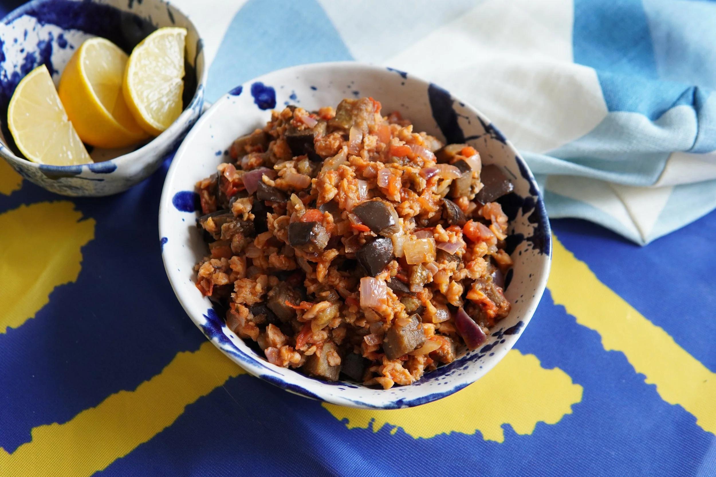 Notre itération a remplacé le « kilo de mouton » par un haché végétal et nous avons quelque peu réduit les doses. Douze aubergines, six tomates et six oignons, ça nous semblait ambitieux pour ce qui est présenté comme une recette de petit-déjeuner pour un père et ses deux fils (même si nous ne doutons pas de l’appétit dévorant de Moïse Lénine Mussolini¹, 5 ans). Place à la cuisine.