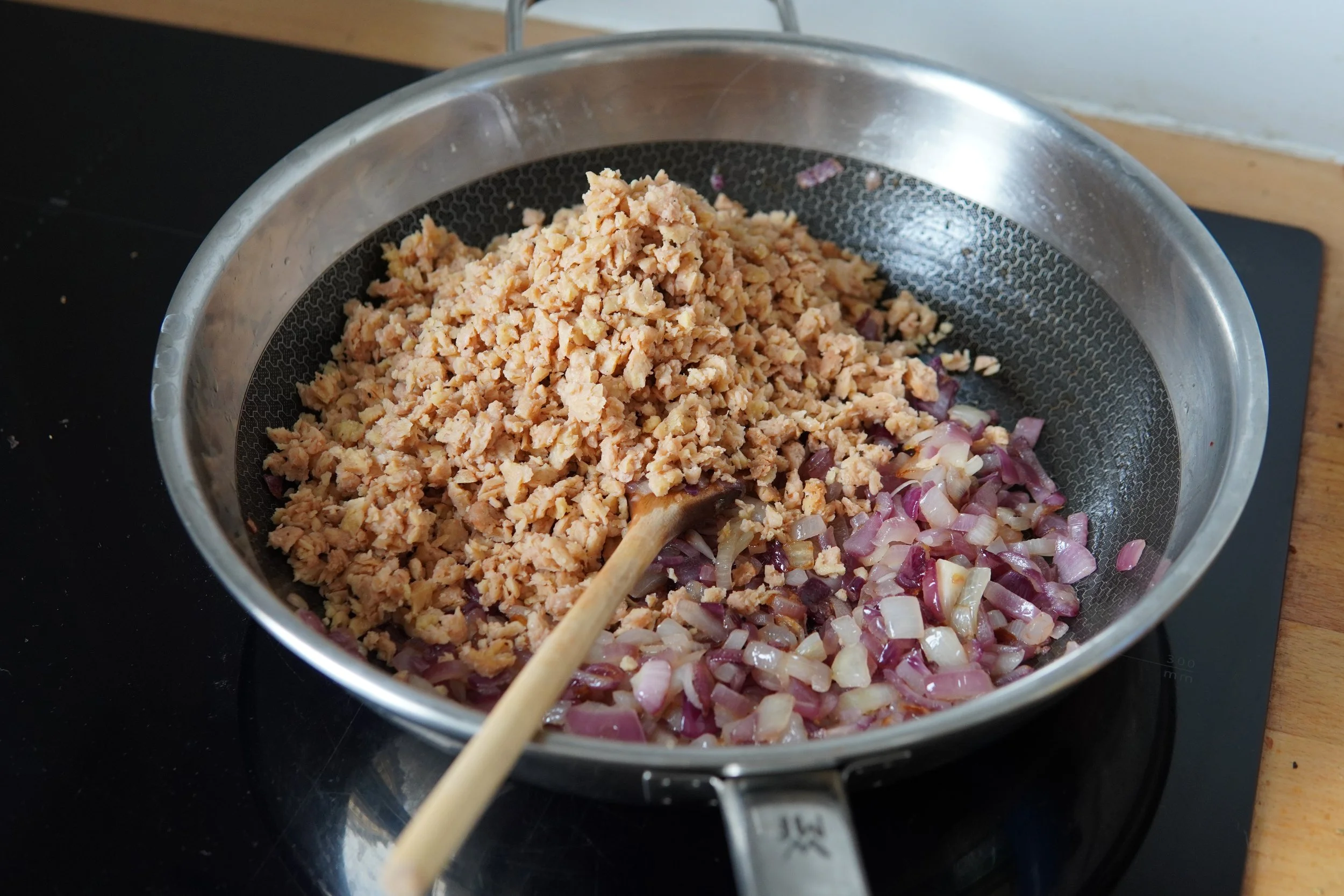 Commencez par préparer le haché végétal (ou procurez-vous un kilo de mouton haché pour 20 drachmes comme Rébecca). Faites gonfler les protéines de soja dans 50 à 60 cl d’eau frémissante pendant 15 minutes avec le laurier, les clous de girofle, le sumac, le paprika et le sel. Égouttez le tout, et ôtez le laurier et les clous de girofle du mélange. Assaisonnez avec la levure maltée (cela donnera un goût d’umami à l’ensemble, pour leurrer au mieux la viande). Si vous utilisez des protéines de soja plutôt grosses, vous pouvez hacher le tout au blender pour un effet viande hachée des plus réussis.